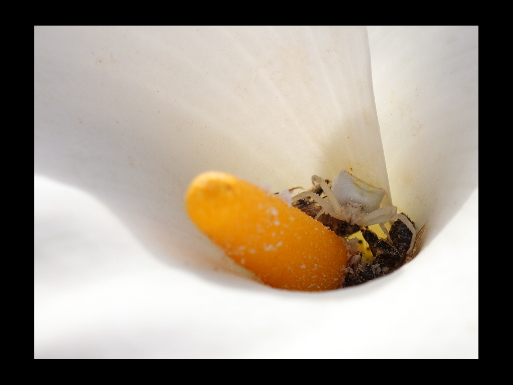 Peccato invece per il colore bianco dei petali; certo, la colpa è del ragnetto che si è scelto proprio quel fiore, ma sai, fiore bianco e ragno bianco...tono su tono rende la foto un pò piatta e non fa risaltare bene il soggetto anche se sei riuscito a gestire la luce in maniera ottimale...(immagina uno sfondo verde oppure lo stesso soggetto posato sui petali di un papavero).