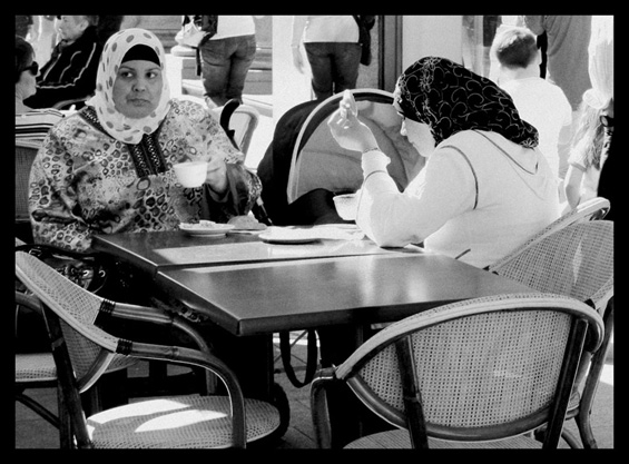 La differenza però moebiuz è che la fotografia qui è posta a critica per il suo contenuto e non a corredo di un tuo articolo di giornale, per far si che la tua idea era più leggibile, usando solo il fotogramma, era necessario riprendere le due protagoniste in uno scenario più ampio, immerse all'interno di una communità di italiani(perlomeno dal modo di vestire), riuscire a estrapolare poi i due soggetti dal gruppo, era compito del'osservatore, ecco perchè all'inizio tra parentesi dicevo che lo sfondo con tutta quella gente era più funzionale come storia, si andava a creare visivamente la contraposizione fra i diversi modi di vestire, ma dovevano essere ripresi nella loro totalità.