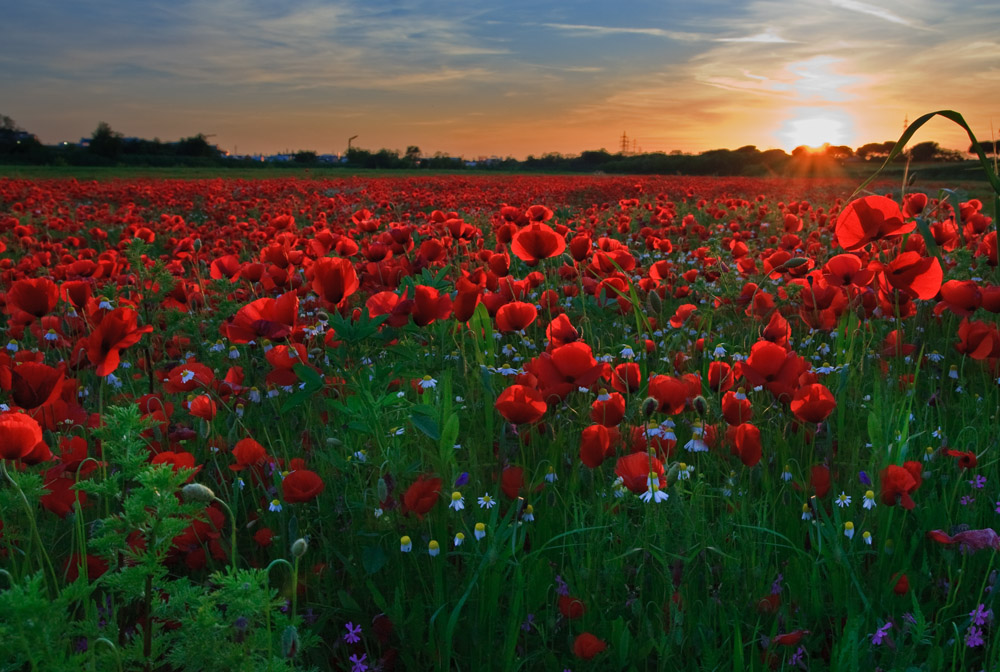 Brillano i papaveri e contrastano con efficacia sul verde scuro del primo piano.