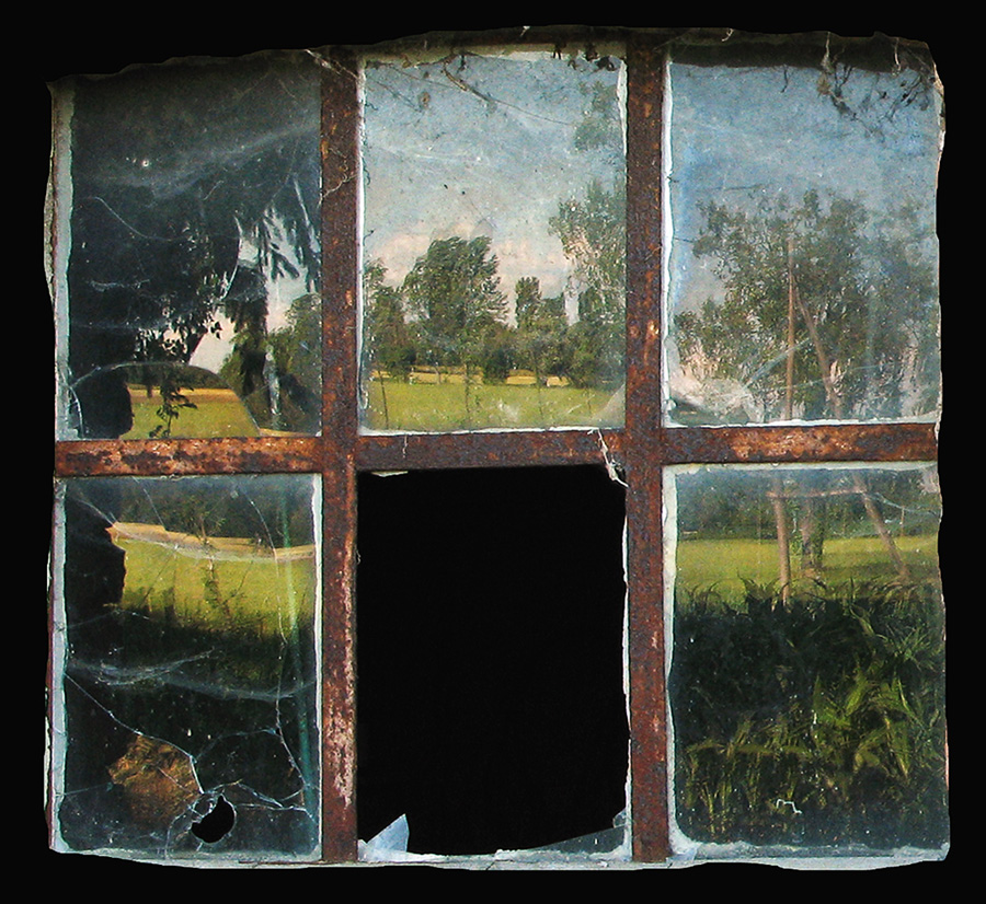 La finestra funge da spartito in rettangoli di un quadro composto in sei settori del paesaggio riflesso.