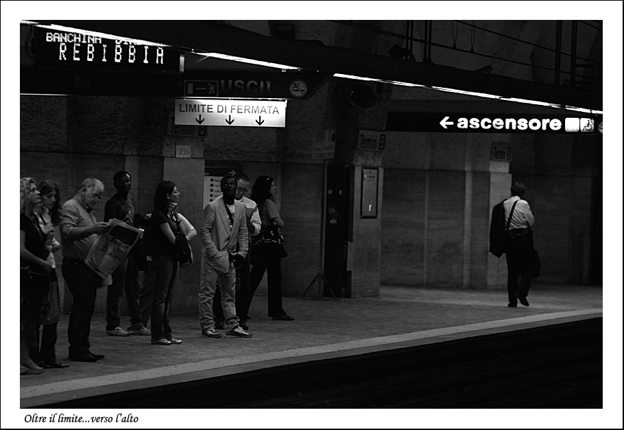 Con tutto ciò volevo solo esprimere un concetto...un mio pensiero...."Per salire, andare verso l'alto bisogna uscire dalla massa, bisogna oltrepassare il limite". Un mio pensiero personale. Tutto qui. ...e per la brutta luce della metro...hai detto bene..."BRUTTA luce" e proprio cosi la voglio, perche la luce la sotto non è molto gradevole. ...e per la ragazza tagliata....non mi importa, non è il soggetto importante ....fa semplicemente parte della massa.