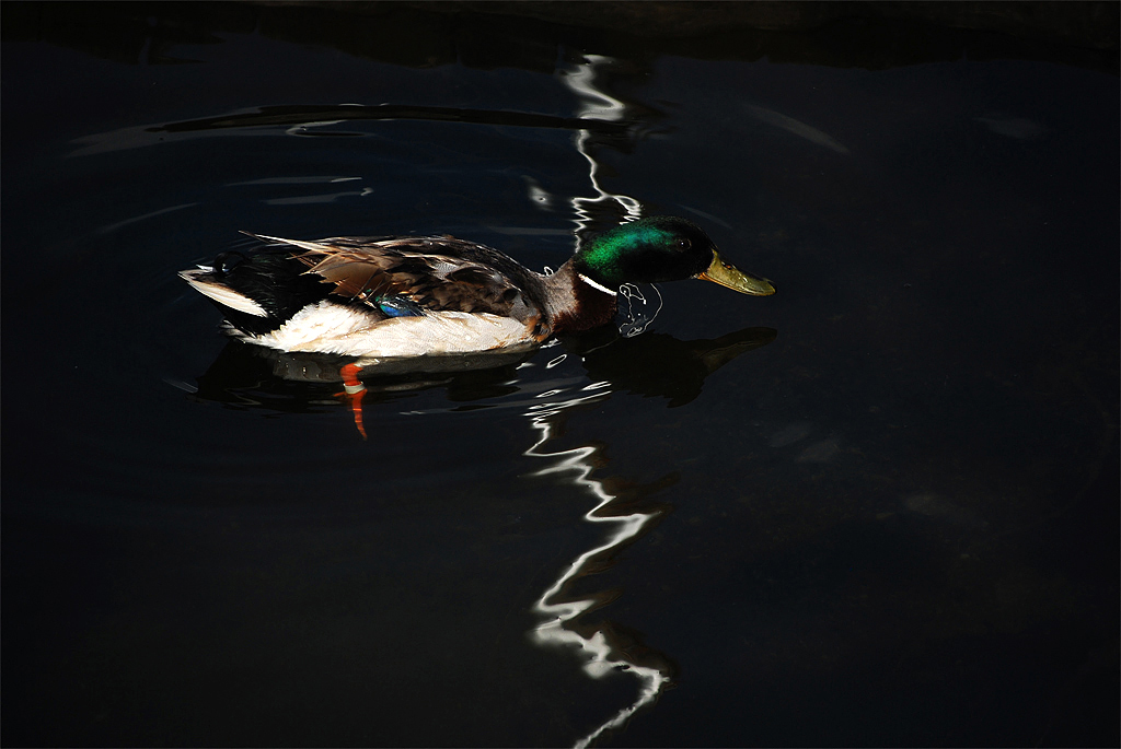 Ho atteso che il germano passasse sul riflesso bianco dell'albero di una barca a vela cercando di evitare altri elementi di disturbo; non mi aspettavo che in quel momento protendesse addirittura la testa in avanti come un velocista sul filo di lana.