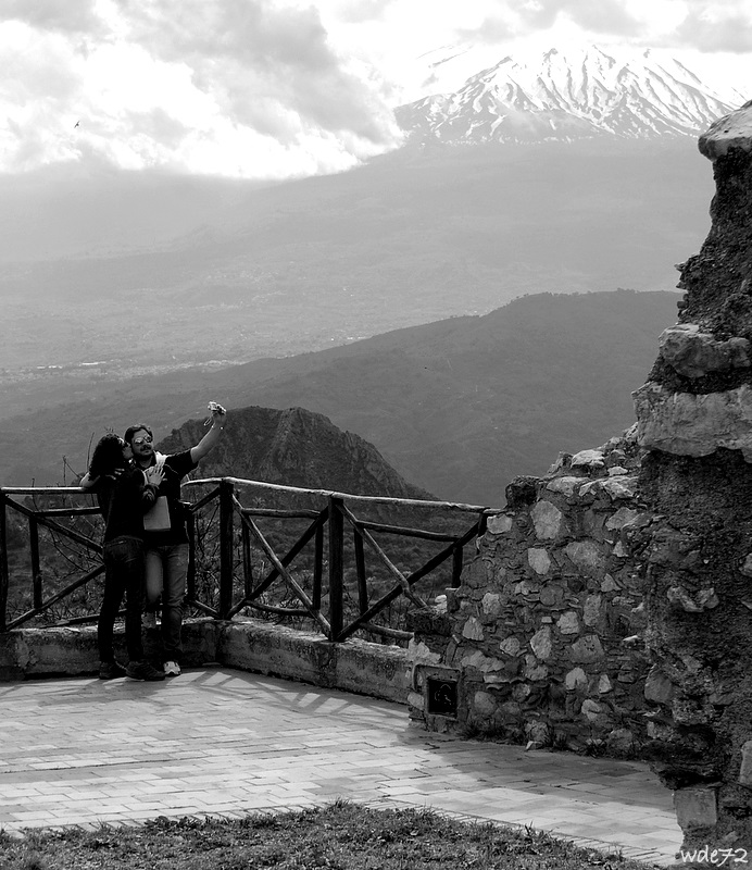 Castel Mola: un paesaggio fantastico nel quale si intravede anche l'Etna imbiancato. Una coppia si fotografa con quella meraviglia alle loro spalle.