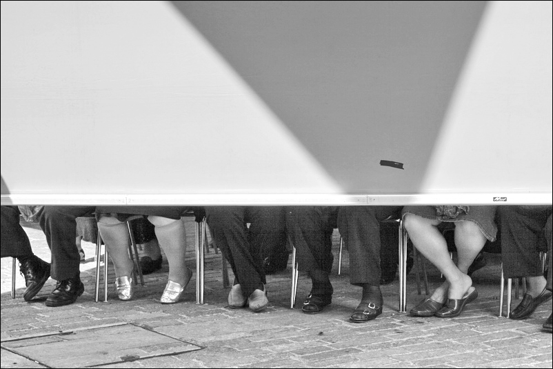 Mi piace molto questo scatto nonno: forse perchè sono particolarmente attratto dalle scarpe delle persone che raccontano molto di chi le indossa. Bella la composizione che gli hai dato semplice e pulita: hai creato un motivo regolare di elementi simili cercando di comprenderne il più possibile. L'efficacia di questo motivo ritmico di gambe e scarpe deriva anche dallo spazio che sei riuscito a creare: fai arrivare sapientemente questi elementi fino ai margini dell'inquadratura guidando piacevolmente la percezione dell'osservatore ben oltre i limiti visibili del fotogramma; non disturba molto il taglio delle gambe del personaggio sulla destra del fotogramma. La resa dei toni è migliorabile.