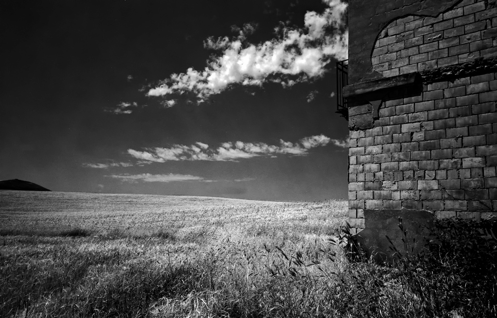 Qui per me è palese l'apertura spaziale del campo, il respiro del cielo ampio... eppure, la matericità di quel muro a vista, ipoteca la scena e stringe lo sguardo nella immobilità e nel silenzio.