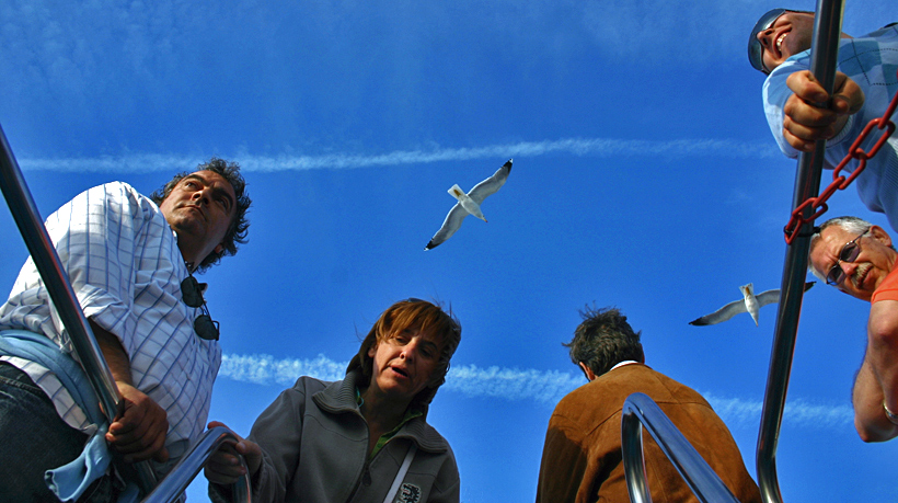 la foto è buona per la composizione curata delle persone e per il punto di ripresa; diventa ottima per i due gabbiani ripresi mentre volteggiano sopra alla scena; eccellente se l'ala del gabbiano di destra non fosse stata "passata" dalla ringhiera. ma già è segno di gran bravura aver colto questo "insieme".