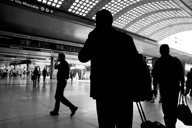 Belle queste anime nere in viaggio, in conversazione, in cammino: contro il bianco accecante dell'ambiente e delle aperture architettoniche verso l'esterno, diventano solo sagome, dinamiche e quasi senza volume, solo lo spessore emotivo che i loro gesti suggeriscono.