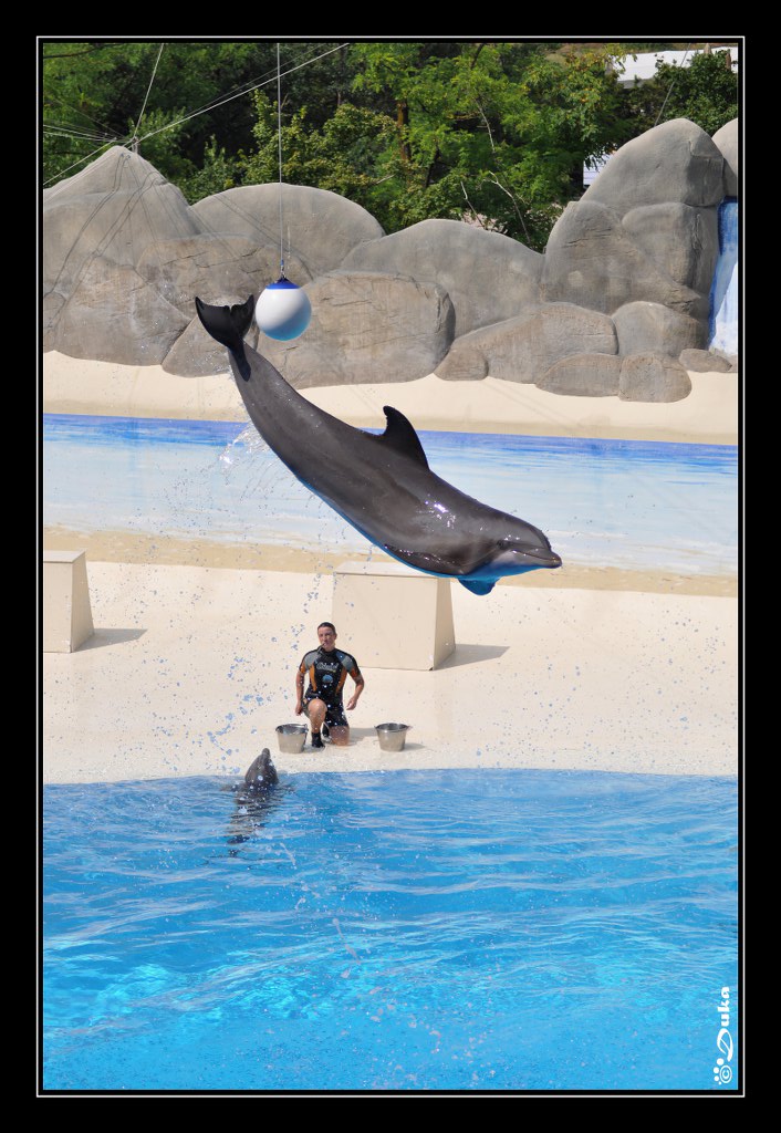 E' un'immagine gradevole. Dalla posizione in cui eri, comunque interessante, sei stato limitato dall'apertura max del tuo zoom che non ha permesso di sfuocare un po' lo sfondo, che si sovrappone un po' troppo al delfino e alla palla.