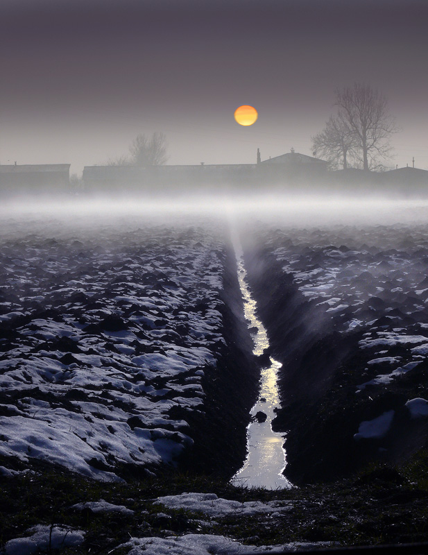 I paesaggi delle foto di questo reportage, chi è emiliano li ha visti e rivisti; nella fattispecie, sono costati anche fatica, non poca; attese al freddo, appostamenti in punti inusitati per aspettare un preciso momento ( il lasso di tempo in cui il sole si presenta così dura veramente poco, è come se fuggisse);