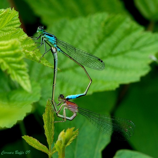 Le due libellule non sono sullo stesso piano, quindi occorre giocare sulla pdc per avere nitida l'immagine, infatti la coda finale del maschio (quello sopra) perde un po' di nitidezza.