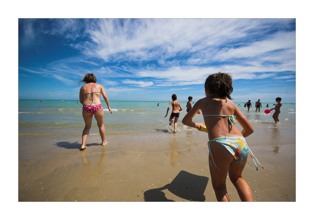 Malgrado i soggetti siano presi di spalle si immaginano i sorrisi e l'eccitazione del momento....il via libera dato dai genitori e l'inizio delle danze di giochi acquatici.