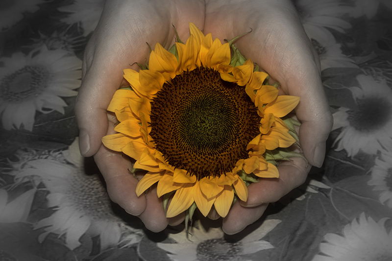 Che bella idea. C'è davvero gentilezza e accoratezza in quel gesto della mano che sembra ridonare nuova linfa vitale al fiore di girasole rifondendo il colore mancante ai suoi compagni sullo sfondo tappezzato. Un buon uso della desaturazione, delicato. CIao Tiziano  |