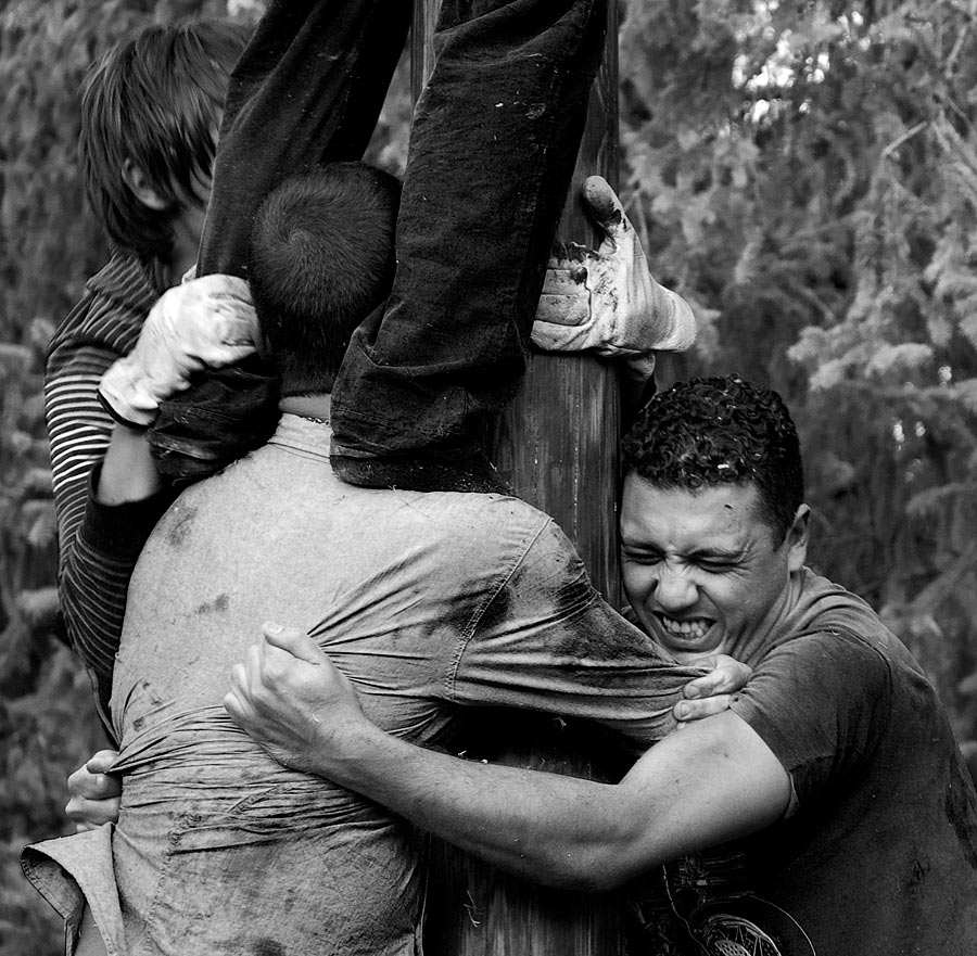 mi verrebbe da dirti che mi spiace che il viso del ragazzo sulla sinistra sia coperto... ma al contempo posso dirti che l'espressione del ragazzo di destra parla anche per gli altri. Per me è molto bella così. Hai ripreso molto bene questa scena, con un ottimo b/n. La chicca sono le mani che si aggrappano con tanta forza alla maglietta di uno dei ragazzi