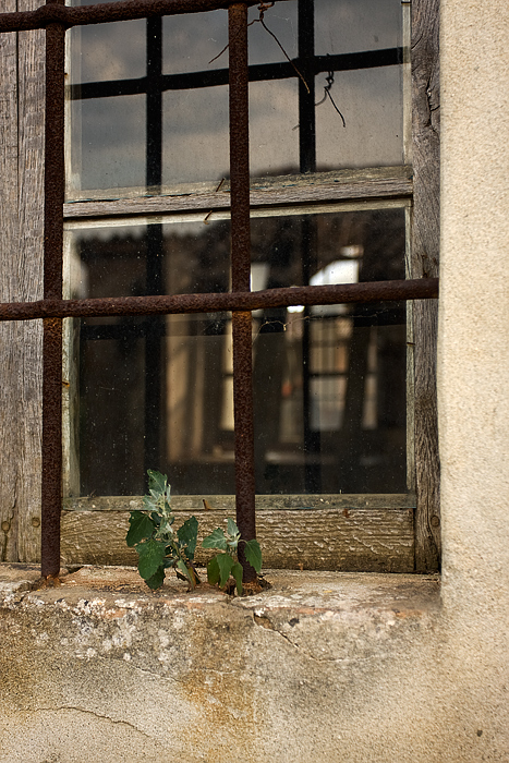 Dalla costruzione dell'immagine, molto ortodossa per altro, si può notare quanto sei stato attratto giustamente dalla curiosa presenza delle piantine nate nella pietra della soglia della finestra a sbarre di ferro tipica delle case di campagna, anche mezzo abbandonate, che si fanno rugginose.