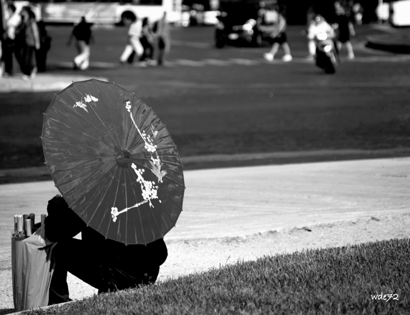 Il personaggio in primo piano che scegli come polo narrativo per introdurre la scena è ripreso di spalle, ai limiti del fotogramma, senza un accenno a gesti significativi, annullando ogni tentativo di interpretazione dello spectator. Tu ci aiuti leggermente nella codifica dell'avvenimento dicendoci che è stanco e noi intuiamo che è un venditore di ombrelli perchè ne ha un fascio sulla sua sinistra: possiamo indugiare qulche attimo sulle decorazioni orietali dell'ombrello: niente altro. Lo sfondo del fotogramma invece appare ricco di elementi urbani che potrebbero contestualizzare, dialogare con una rima insieme al tuo personaggio. Il consiglio Walter è quello di individuare un trait d'union fra le due componenti: uomo e ambiente.