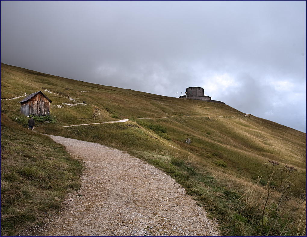 Presso il Passo Pordoi. Il piccolo fienile forse non si sposa molto col sacrario. Comunque valida immagine per la strada in primo piano e per le nuvole sullo sfondo. Bello anche il silenzio che si percepisce. Ciao Francesco _________________ Fotocamere Olympus OMD e PEN, Panasonic G3. Software GIMP