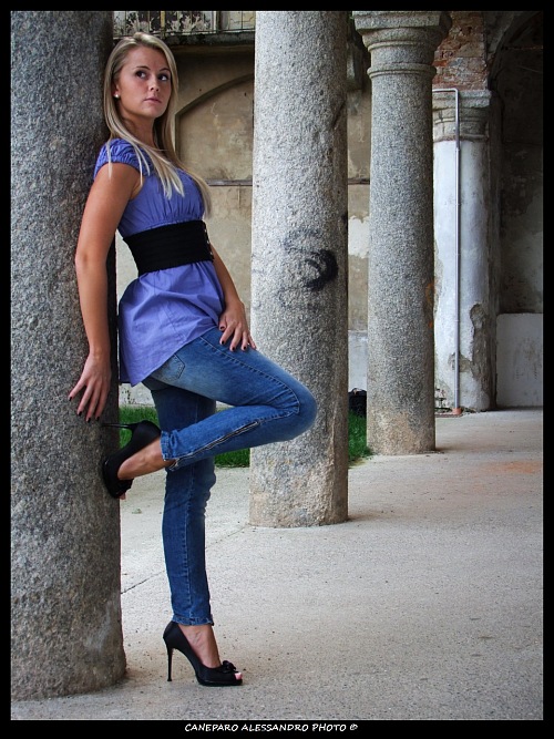 Mi piace l'idea. Avrei personalmente chiuso un po' più l'inquadratura a destra e clonato via il segno nero sulla colonna centrale al fotogramma. Forse lo sguardo più verso la camera avrebbe giovato: così la posa mi sembra un po' tirata (come nell'altra).