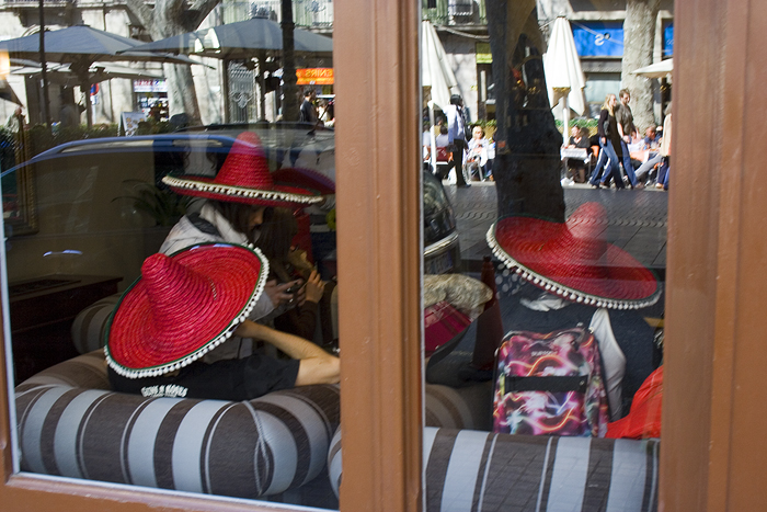 L'idea è buona: sembra però che ci sia tanta carne al fuoco: sento la mancanza di un centro d'interesse forte che dia sostegno e guidi la lettura del fotogramma. I tre sombreri , i tipici cappelli messicani, caratterizzati da un colore rosso intenso e dal classico bordo molto largo non reggono da soli l'attenzione poichè l'occhio continua a cercare affannosamnete altri dettagli per interpretare e dare un senso, anche solo formale. Il riflesso e tutto il suo contenuto, macchina parcheggiata, passeggiata, ombrelloni, turisti a passeggio, etc, accentuano l'entropia del fotogramma disorientando l'osservatore. Io avrei cercato di rendere più semplice la fotografia evidenziando un'analogia, un gesto un riflesso senza affollare troppo la fotografia.
