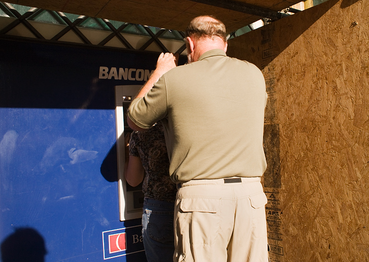 Sembra piuttosto un taglio condizionato dalla necessità di scattare al volo... non mi convince del tutto, anche se la scena è alquanto particolare, l'uomo cerca con il suo corpo di far in modo che il monitor del bancomat riesca a essere più leggibile e la posa assume una certa particolarità.
