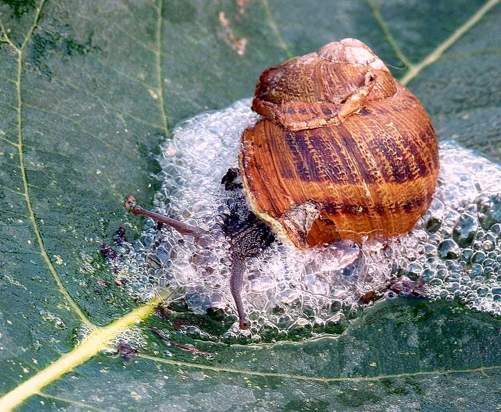 Al di là dei commenti che già hai ricevuto (Pier) e che peraltro condivido, credo che la scvhiuma sia un mezzo di protezione della lumaca ferita o avvelenata. Qui il guscio in effetti mi sembra devastato ...
