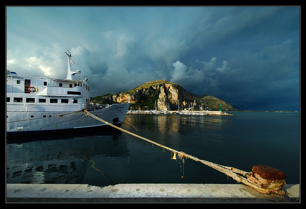 e tornato ottimamente con una magnifica prospettiva di questo ormeggio che sembra non finire mai. eccellente anche la resa del cielo minaccioso di nuvole nere e della bella luce che lambisce il promontorio.