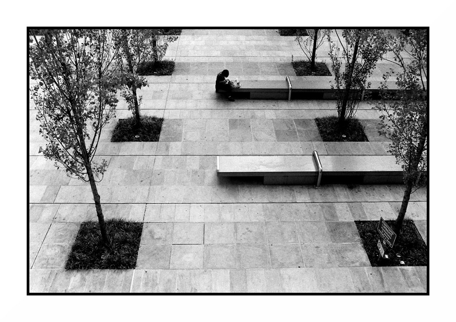 Ben trovato il riflesso di luce che schiarisce la panchina vuota: l'occhio è guidato prima sull'assenza, solo poi sulla figura soprastante.