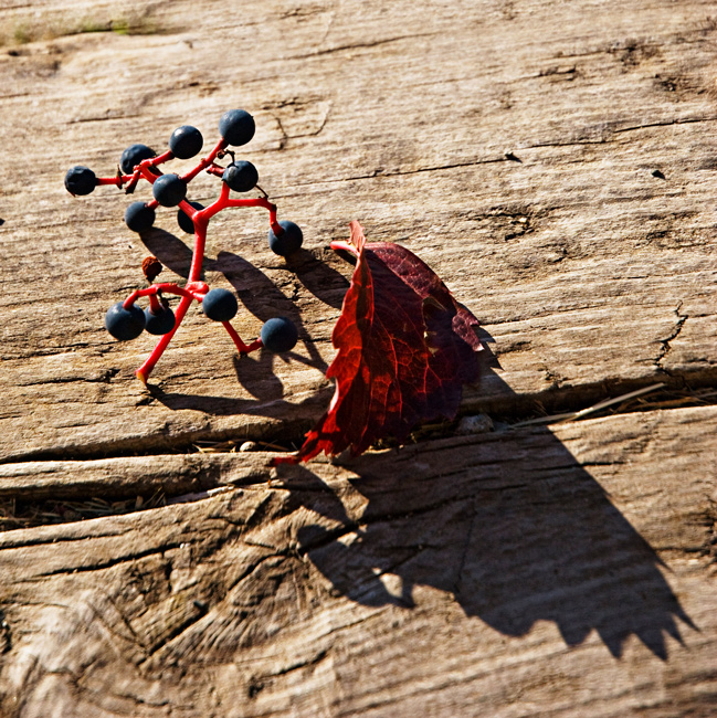 Mi piace la scelta di scattare in condizioni di luce che rifuggono ogni morbidezza e che accendono di colori netti gli oggetti. peccato, come già sottolineato da Taziano il primo piano non a fuoco, forse avrebbe rubato un poco la scena a bacche e foglie ma, avrebbe aggiunto maggiore concretezza al tuo lavoro.