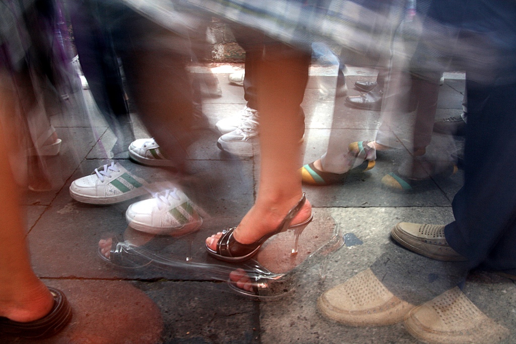 Utilizzi la tecnica del mosso ed una inquadratura stretta per esprimere un concetto preciso di cui ci dai conferma nel titolo. Le scarpe della gente sono sempre state molto interessati e rivelatrici di caratteri. Qui abbiamo una danza tribale, un caleidoscopio di forme e colori che rendono bene l'idea del traffico, della gente, del fluire dlle loro vite, segnate da ritmi diversi. Avrei tagliato quel tallone sulla sinistra del fotogramma che rompe l'equilibrio compositivo costruendo un immagine più bilanciata che fa di quel piede femminile con la scarpa ed in particolare con il tacco a spillo il pernio rotante di questa immagine dinamica ed originale.
