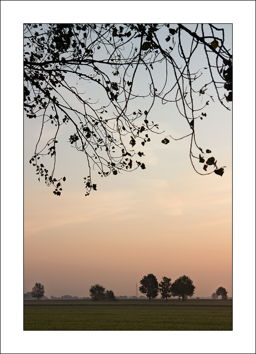 la luce è come sempre dolce e morbida, ma in questo caso mi piace come si contrappongano i decori delle foglie e dei rami alla pianura dello sfondo.molto gradevole Ok!