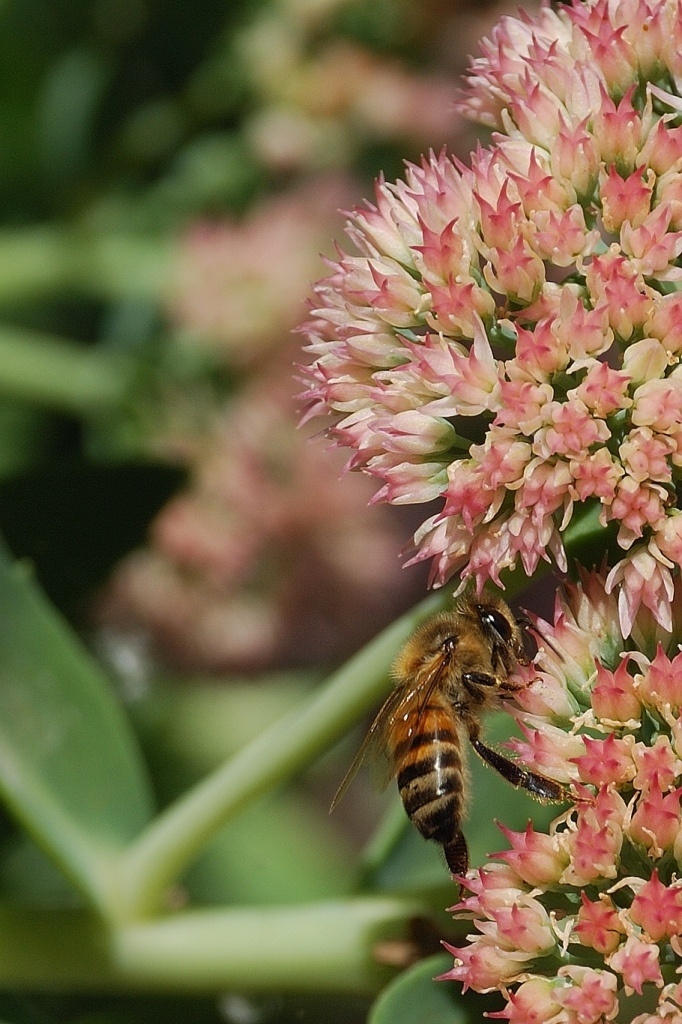 Nell'insieme una discreta foto. A mio avviso però, sembra che il principale soggetto siano i fiori e non l'ape, forse meglio stringere maggiormente sul soggetto.