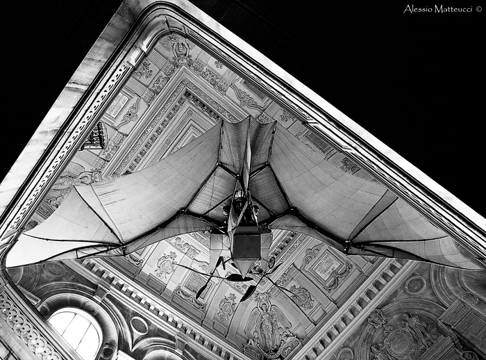 Idea particolare e piuttosto ben riuscita..., non so se fosse stato possibile un taglio più largo in alto e a sinistra ma comunque il b/n che mimetizza la macchina volante con i disegni del soffitto mi sembra una trovata geniale, quasi una sorta di Escher.