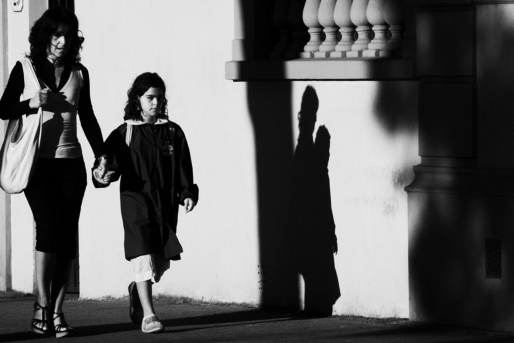 un soggetto semplice e al tempo stesso pieno di significato, ripreso genuino nella strada. La composizione è buona con i due personaggi che entrano nella scena dalla sinistra assecondando il normale senso di lettura del fotogramma. Avrei aspettato ancora un attimo, il tempo di un passo, per riprendere ben staccate le ombre dallo sfondo chiaro del muro ed evitare di tagliare il gomito destro e la borsa della donna; piccole modifiche sulla gamma tonale di questo bianco e nero per aprire leggermente le parti scure e permettere una migliore lettura dei dettagli.