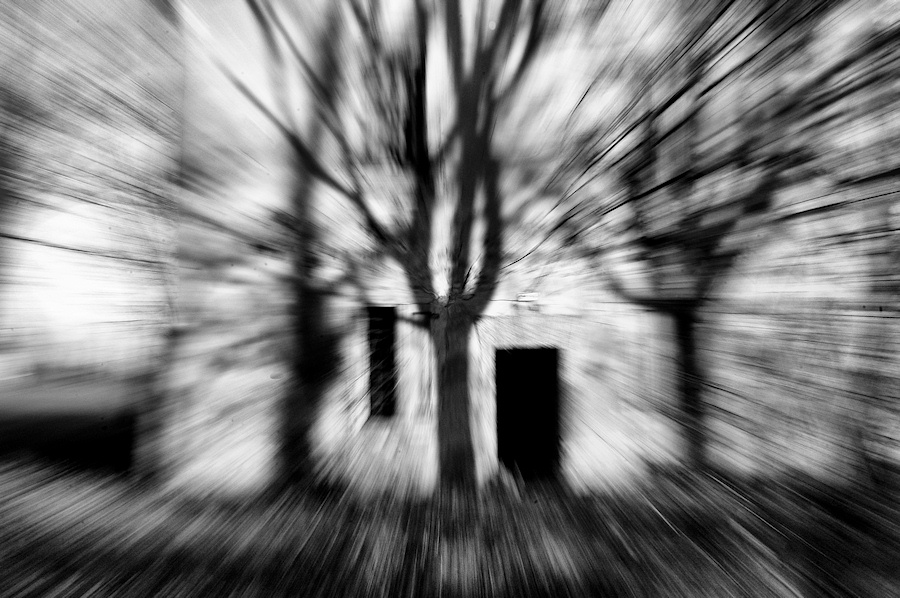Gli alberi ( le loro ombre in realtà, la loro presenza..) quasi due mani scheletriche, che tengono la casa imprigionata in una dimensione fuori dal tempo..E un po' me..è la 'mia casa vecchia' ..la casa in cui sono entrata tante volte, in cui ho scattato fotografie ' personali', della quale ho seguito il lento declino, il lento inesorabile sfacelo ... Ora è quasi totalmente crollata, il tetto sta cedendo , e con questa foto ho voluto ricreare l'immagine della sua ' anima' che esplode, che cerca di scappare, mentre la realtà della vita, degli anni che passano, la costringono , come mani di morto.. a rimanere lì ..e a morire lentamente........
