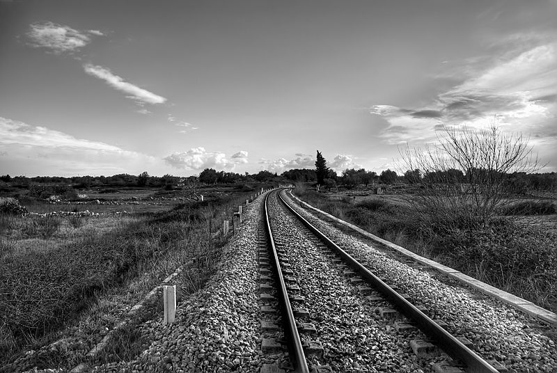 la curva dei binari verso destra mi porta ad allontanarmi, a seguire la strada verso il punto di fuga, nel quale convergono anche le linee delle nuvole.