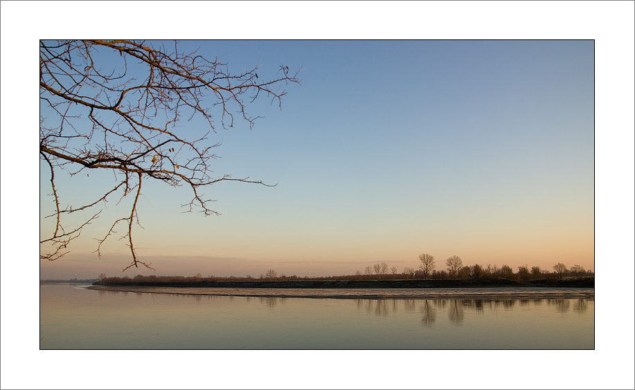 La lenta curva del fiume, suggerita più che ostentata, conduce lo sguardo in lontananza verso un orizzonte di nuvola soffice dai colori tenui, sormontata da un cielo le cui sfumature sfociano progressivamente fino a un azzurro purissimo. Suggerimenti di alberi sulla riva opposta, e un ricamo di rami e rametti spogli in primo piano a dare profondità all'insieme. Colori di perla. Un incredibile senso di serenità. Non mi piace manco per niente (scherzo !). Maledettamente bella.