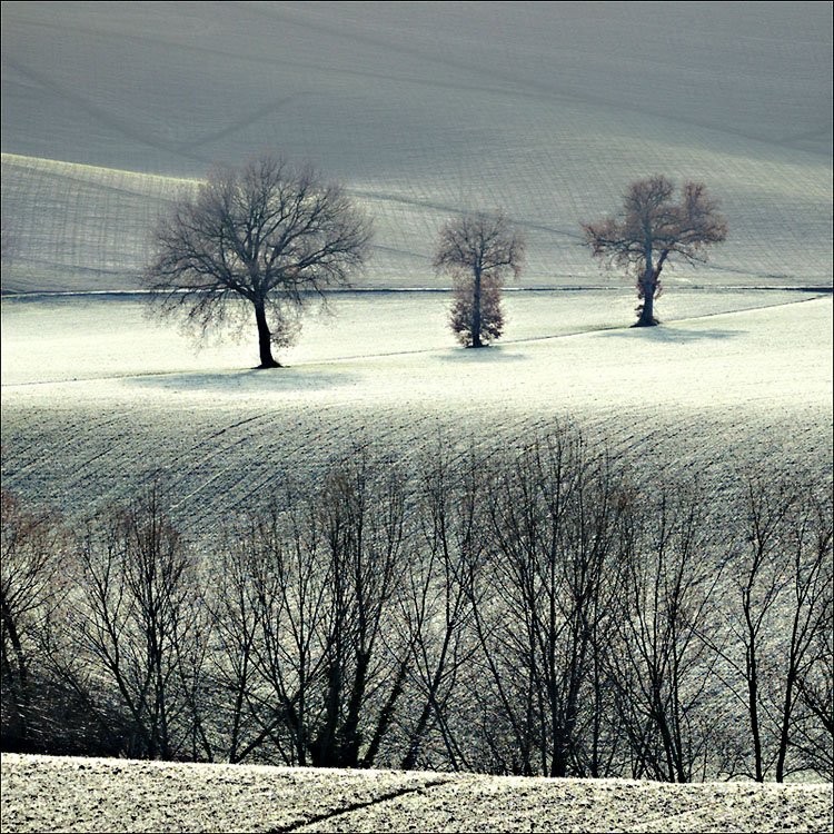 Qualcuno direbbe che gli alberi d'inverno dormono? son come morti? e questi invece che fanno recitano? La siepe in primo piano sembra una folla la cui attenzione è attratta dai tre personaggi la in mezzo. Cosa staranno rappresentando? l'aula di un tribunale? Un ring? ecc ...