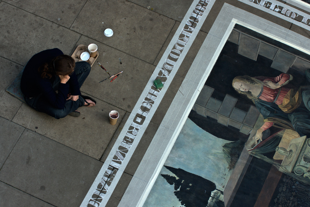 è rarissimo vedere l'annunciazione fedelmente riprodotta, almeno nella figura di Maria, gli artisti di strada, contano che nessuno vada a criticargli la loro opera ma di ricevere solo un piccolo contributo per il lavoro svolto, le mani della Madonna riprese in una posa teatrale come un'istantanea fotografica, mi hanno sempre catturato.