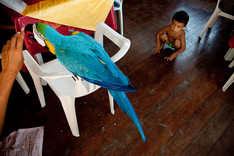 Tutto ciò che è vivo dell'immagine mi piace (bambino, mano, pappagallo), bello anche il parquet, non male nemmeno il foglio di giornale. Tutto ciò che è plastica imbruttisce la foto, primo perchè di plastica, poi perchè i colori si fanno troppo vedere; il bianco della sedia abbaglia, il rosso della tovaglia non è lo sfondo migliore per il pappagallo, il triangolo giallo è anch'esso troppo presente. Ciao
