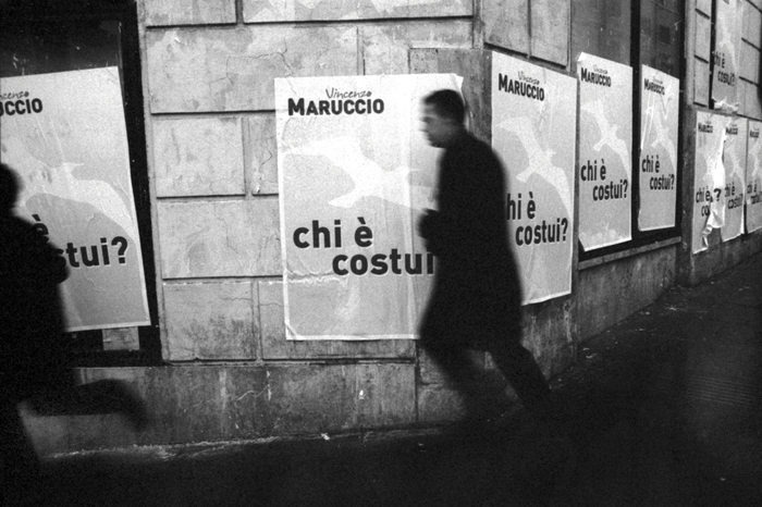 tutto ruota intorno a quella scritta e su quella devi costruire la meglio relazione visiva fra i vari componenti dell'immagine. Viene naturale il porsi la domanda dei manifesti, associarla alla sagoma che corre ma contemporaneamente arriva all'attenzione anche la seconda scritta in alto che ci dà già una risposta ( è Maruccio....Vincenzo.....) e poi abbiamo ancora una sagoma che stà uscendo dal fotogramma che partecipa dello stesso principio associativo: mi verrebbe da dire: chi sono costoro? tralasciando il fatto che il taglio resta audace e coraggioso. Prova a pensare se l'inquadratura della tua istantanea avesse tagliato la testa al passante centrale che corre: avrebbe annullato l'identità della persona facendo felici tutti gli strettaroli di sezione, e contemporaneamente avrebbe eliminato anche la possibilità visiva all'osservatore di dargli il nome di Vincenzo Maruccio. Avresti creato una sorta di illusione, resa molto scenica e ricca di pathos grazie alle altre buone scelte tecniche e compositive del tuo fotogramma. Avrei aspettato anche che la sagoma a sinistra fosse uscita dal fotogramma..