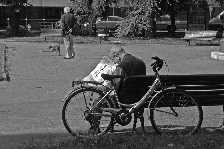 Nessun attimo particolare a sancire le proprietà street dell'istantanea. L'anziano signore, intento a leggere il quotidiano sulla panchina della piazzetta rappresenta il soggetto prncipale dell'istantanea: la bicicletta appoggiata rappresenta un disturbo evidente, andandosi a giustapporre alla sagoma dell'uomo. Il giornale recita qualcosa come evidenzia Lilian ma è talmente piccolo che lo sguardo, già pigro dall'inizio, non elabora volentieri. Poi abbiamo nei piani retrostanti del fotogramma un'altro signore anonimo, ripreso di spalle, che porta a spasso il suo cane. La piazzetta deserta di città, con le auto parcheggiate ai lati della strada contestualizza la scena. In definitiva una scena di città piuttosto normale, che non rimane vivida impressa, ripresa con una inquadrautura ed un punto di vista perfettibile. In queste occasioni conviene passeggiare ancora, guardare ancora,, ascoltare ancora e poi, forse, arriva la voce interiore che ti dice di fare click...lìimportante è sentirsi bene!
