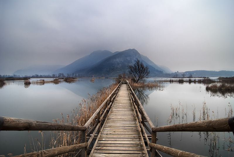 foto molto molto bella, ottima nitidezza e incantevole la nebbiolina che lascia un velo di mistero.. mi sento comunque di farti una piccola critica,.. a mio parere avresti dovuto mettere il ponte esattamente al centro del fotogramma, così da far comparire due immagini simmetriche e più o meno speculari..