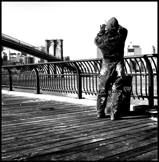sì hai letto bene art terrorism giocando con l'immagine di lei (è un'artista) che si accinge ad attaccare artisticamente il famoso ponte o kla skyline di NY: sta infatti usando le mani come cornice per decidere l'immagine da riprodurre.