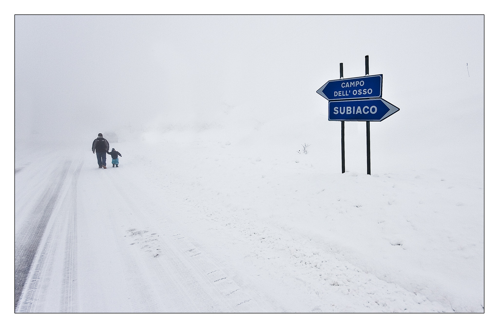 notevole questo scatto, la presenza umana in questo mare bianco, insieme ai cartelli, ci riporta alla realtà odierna, dobbiamo scegliere una direzione!!