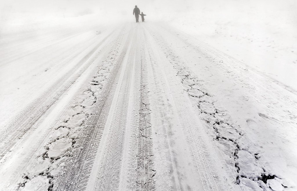 sembra che se ne stiano andando verso il paradiso o comunque al di là del mondo reale, su una stada innevata solcata da disegni (bello il termine usato da damp:merletti). composizione congeniale allo scstto, con le linee prospettivhe che portano verrso l'alto ed il centro.