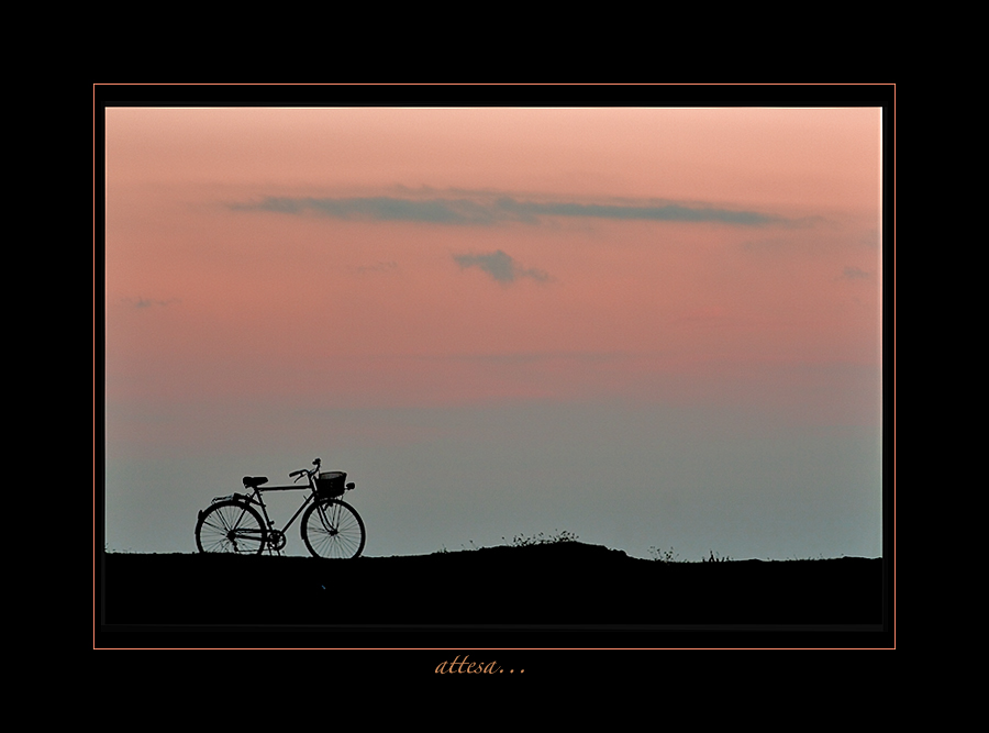 I caldi colori del tramonto fanno da sfondo alla semplice silhouette di terra e bicicletta: un'essenzialità questa che l'immediata percezione di atmosfera e messaggio.