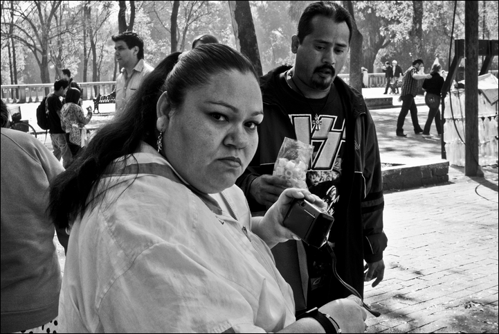 Lo sguardo in camera funziona molto bene: complice la fisionomia caratteristica della donna. Il contrasto fra la femminilità desiderata ed evidente, nella cura dei capelli e negli ornamenti tipicamente femminili, (come i pendenti alle orecchie) con l'aspetto fisiognomico scientifico del complesso facciale, mascolino e robusto, contribuiscono a caratterizzare il personaggio e a caricarlo di attenzione. Non vuole essere guardata: la sua volontà è precisa e definita dall'espressioe arcigna: questo non collima con il desiderio dell'autore che vive un senso di disagio. Lieve giustapposizione di una coppia di passanti dietro allo sguardo. Il vuoto e la zone chiara presente davanti alla donna non riesce ad influenzare l'intensità dello sguardo in tutta la sua carica di ostilità.