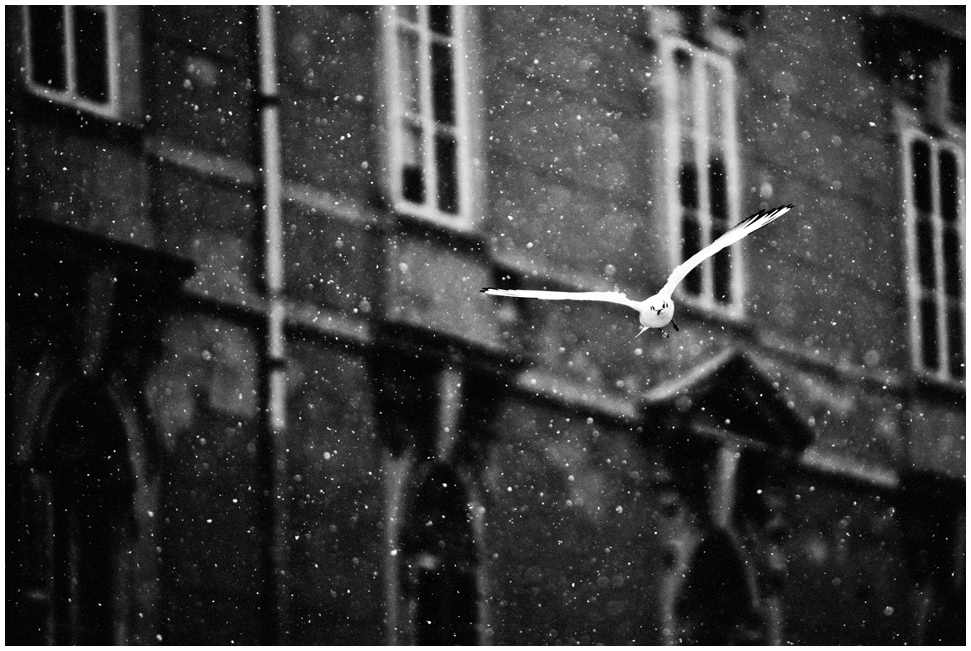 gradevole la posizione del gabbiano e la sensazione tridimensionale della nevicata.
