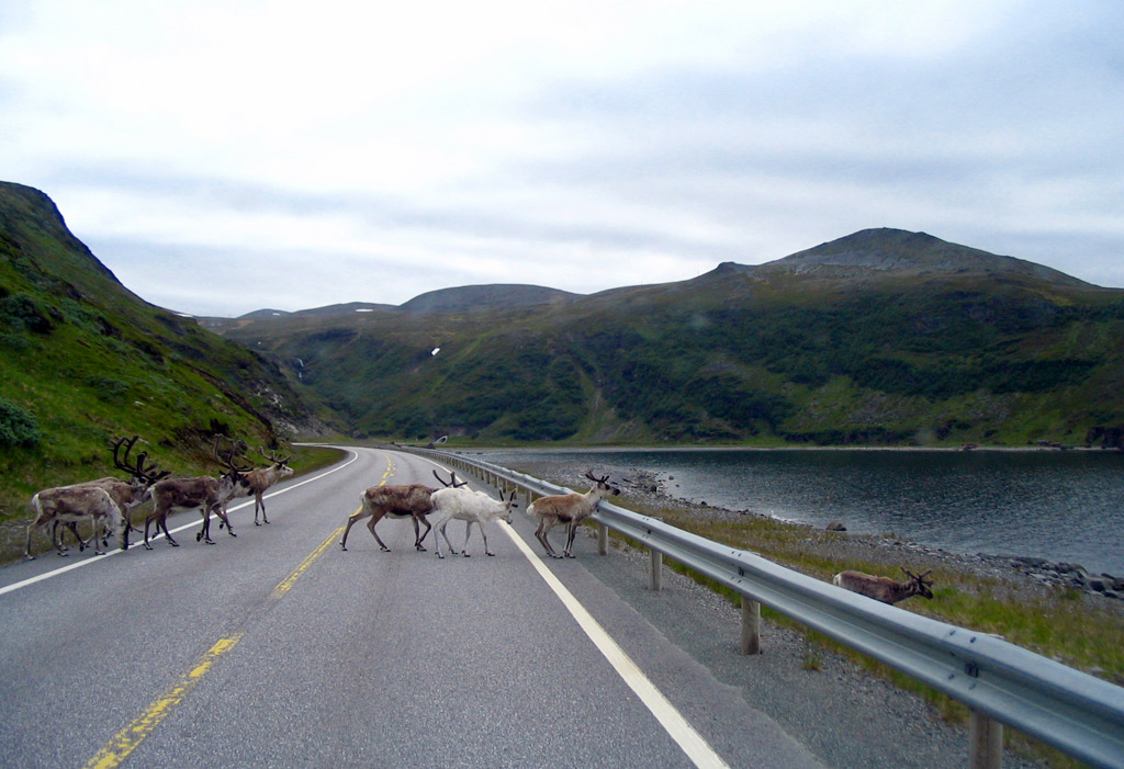 Incontro bellissimo e abbastanza consueto sulle strade norvegesi su cui bisogna procedere con molta attenzione poichè le renne timidissime, ostentano la più assoluta indifferenza al traffico stradale.