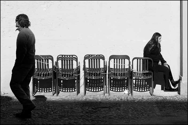 Una distanza irrimediabile, apparentemente incolmabile, che stà per compiersi. Fra poco uno delle due figure antitetiche uscirà di scena, fuori da questo palcoscenico illuminato per lasciare il posto a quelle sedie vuote e legate, le uniche testimoni silenziose di questo momento triste. Tutto è finito. Bravo malko a gestire questa condizione di luce difficilissima e a comporre in maniera elegante questo piccolo dramma urbano.. |