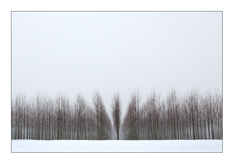 L'algido nitore di cielo e neve costituisce l'ideale scenario per rappresentare l'ordinata teoria degli alberi ed il delicato effetto grafico che ne deriva.